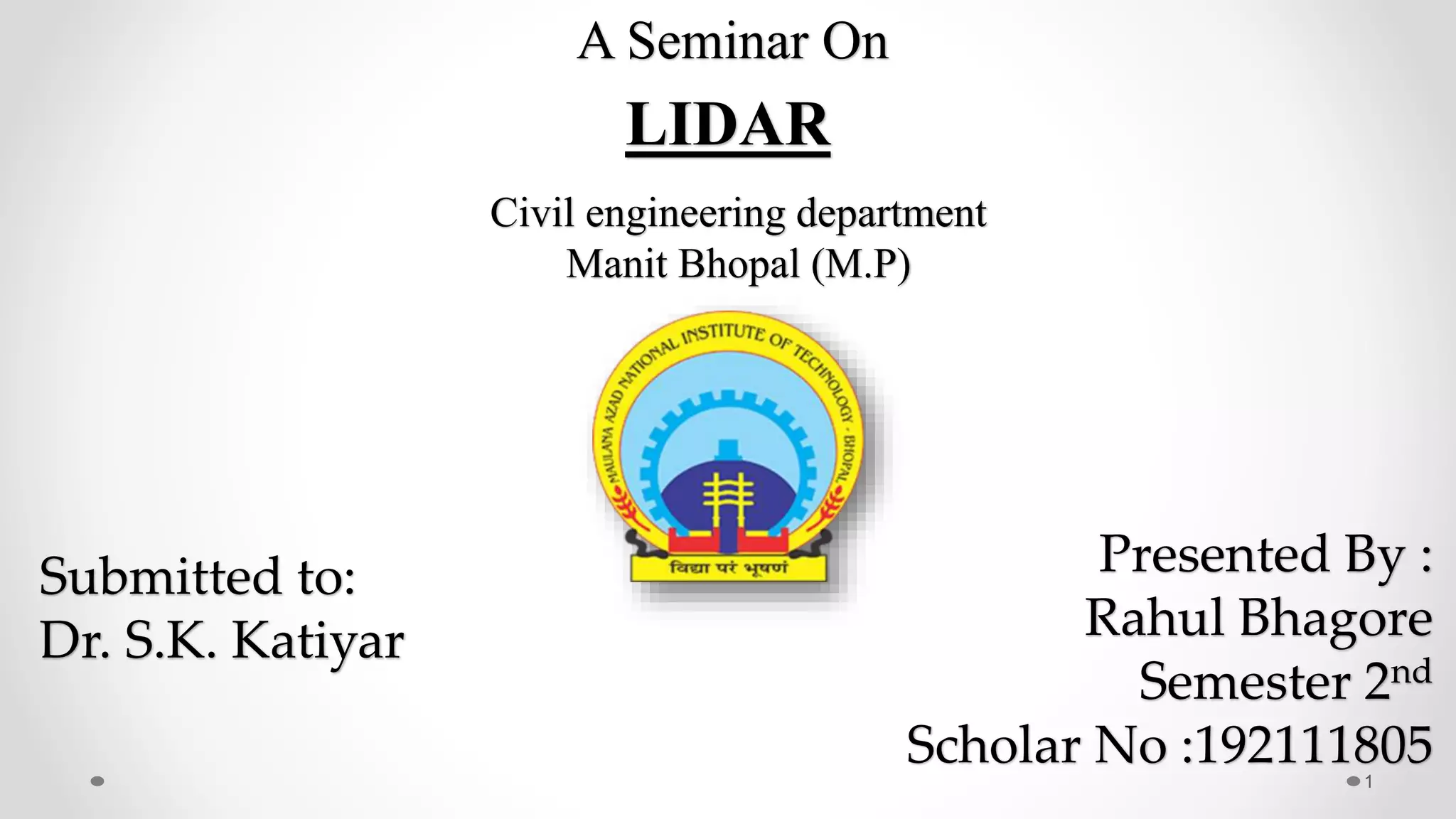 Rahul Bhagore presented on LIDAR (Light Detection and Ranging) technology. LIDAR uses laser pulses to measure distance by illuminating a target and analyzing the reflected light. It has applications in fields like agriculture, conservation, and law enforcement. LIDAR systems can be airborne, terrestrial, mobile, or static. Key components include lasers, scanners, detectors, and navigation systems. LIDAR provides highly accurate 3D data at large scales and through foliage, with advantages over other remote sensing methods.