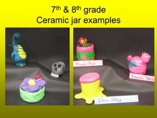 This document provides information about an upcoming ceramics unit for 7th and 8th grade students. It includes standards, project requirements, sculpture terminology, step-by-step instructions, and examples of ceramic boxes and jars. Students will create a lidded ceramic box with specific requirements such as textured sides, a jagged-cut lid, thin even walls, and feet. The document outlines terminology like additive and subtractive techniques and provides worksheets to help students prepare for their project and final exam.