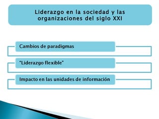 El documento discute los desafíos del liderazgo en el siglo 21 y las organizaciones. Señala que el liderazgo debe ser flexible y adaptarse al contexto cambiante. También enfatiza la importancia de la auto-reflexión, el liderazgo a todos los niveles de una organización y promover un ambiente de aprendizaje continuo.