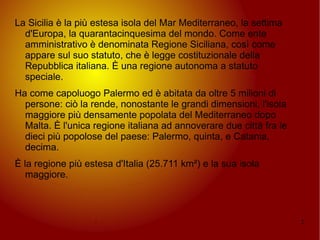 La Sicilia è la maggiore isola del Mediterraneo e la più estesa regione italiana, con oltre 5 milioni di abitanti. Ha una storia ricca, caratterizzata da influenze greche, romane e arabe, e diverse città importanti tra cui Palermo e Catania. Il territorio è prevalentemente collinare e montuoso, con notevoli vulcani come l'Etna e Stromboli.