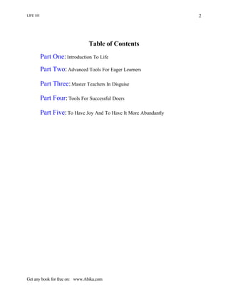 This document provides an overview and summary of the book "Life 101" by Peter McWilliams. It discusses how the book contains life lessons and insights that people wish they had learned in school but did not. The book is separated into five parts that cover introductions to life, advanced learning tools, lessons from influential people, tools for achieving goals, and finding joy. It aims to present hundreds of techniques and suggestions for the reader to consider and apply if useful to their own life and journey of self-discovery. The overview emphasizes that life is about doing, learning and enjoying, and that we are lifelong learners.