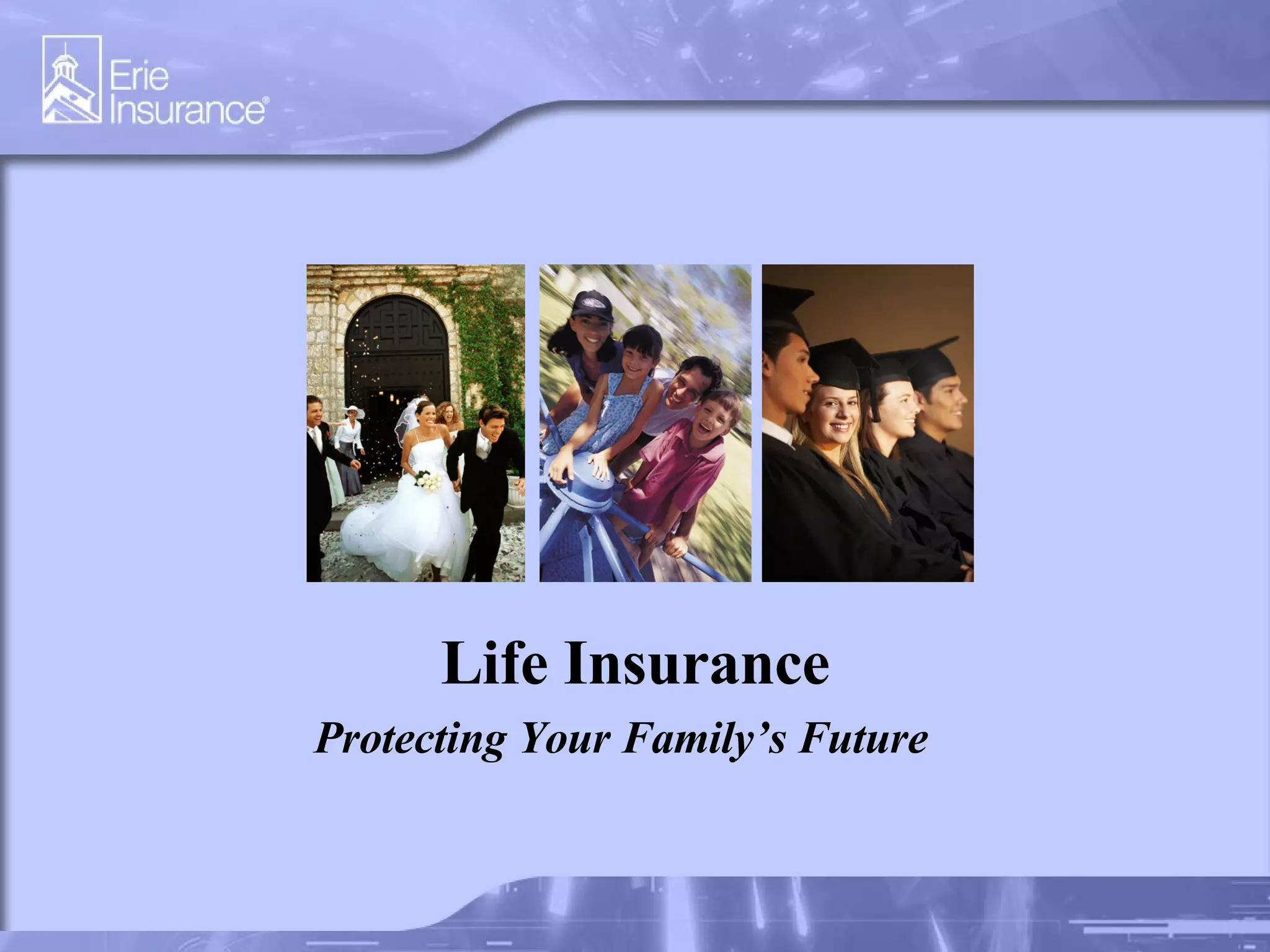 Life insurance protects a family's financial future in the event of a breadwinner's death. There are two main types of life insurance: term insurance, which provides affordable coverage for a set period of time, and permanent insurance, which provides lifelong coverage and allows savings to accumulate. An insurance professional can help determine the right amount and type of coverage needed based on factors like income needs, debts, and future expenses like education.