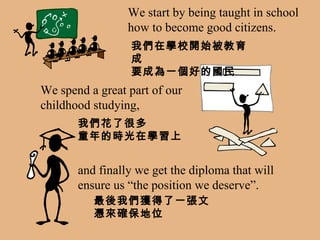 The document reflects on a person's life journey from childhood to adulthood. They discuss the pressures of school, work, and achieving financial success. However, over time they realize they have been living for silly goals and lost connection with friends. They decide they want to make changes by living more simply, spending more quality time with friends and family, traveling, and spreading more love in the world. They hope to find more fulfillment and meaning by focusing less on work and more on relationships and experiences.