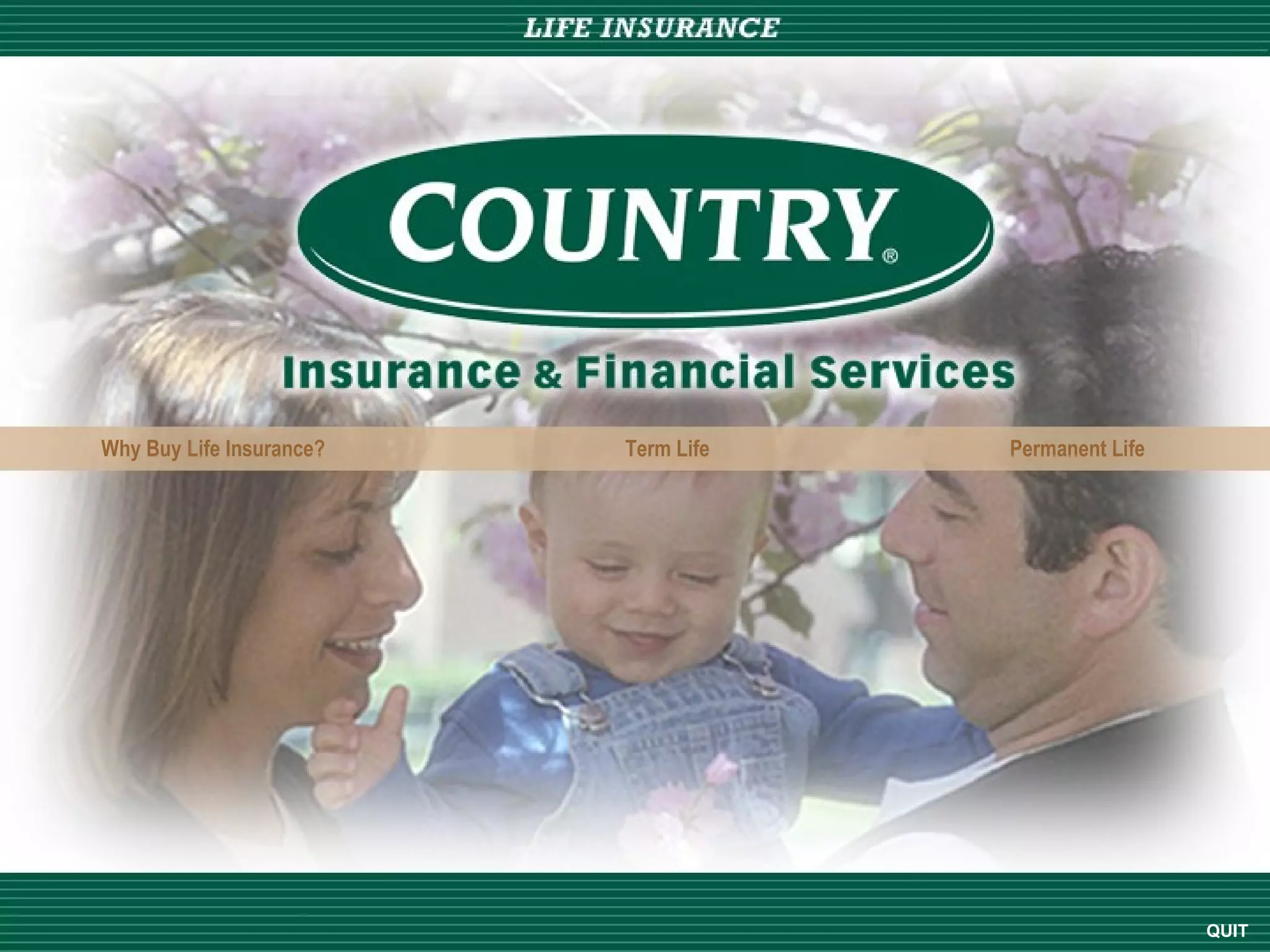 Life insurance can be used to protect a family's financial security in the event of death. Term life insurance offers the lowest rates but only provides coverage for a limited time period, while permanent life insurance such as whole or universal life provides lifelong coverage through the accumulation of cash value over time, though at a higher initial cost. The optimal type of policy depends on an individual's needs and priorities with regards to coverage duration, premium flexibility, and cash value growth.