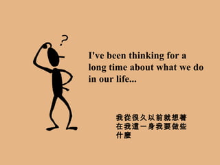 The document reflects on an individual's life journey from childhood to adulthood. It describes the process of getting an education, finding work, building a career through hard work, starting a family, and eventually facing unemployment later in life. It then evaluates this experience and proposes trying to live life in a less stressful way by spending more time with friends and family, traveling, cooking, and focusing on enjoyment rather than ambitious goals. The individual believes this may help them be happier even if it's not clear it will work for everyone.