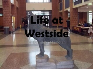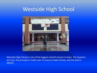 Westside High School is one of the largest schools in town known for its friendly teachers, cool principal, and great food. There are many activities, clubs, and organizations to get involved in to make friends and gain popularity. It is important to keep grades up through diligent work while also preparing for college with help from the college center. Students are kept safe by diligent officers while having fun representing their school as Westside Wolves.