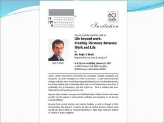 This document discusses creating harmony between work and life. It summarizes a global study that found one-third of workers say managing work-life has become more difficult, especially for younger generations and parents. It then discusses how globalization, technology and other factors have led to a "state of paranoia" and culture of overwork. Ancient wisdom from the Bhagavad Gita is presented on performing one's duties without worrying about results. Modern thinking emphasizes work-life harmony over balance by engaging meaningfully across work, self, family and community. A framework is provided for diagnosing one's situation, talking to others, designing experiments, and taking action to reduce stress and improve performance across all domains.