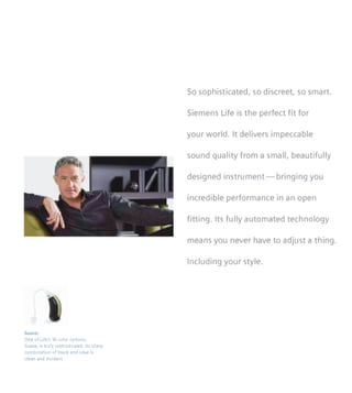 The document summarizes key features of the Siemens Life hearing aids. It highlights their natural sound technology that simulates natural acoustics, their sound comfort technology that reduces background noise and wind noise, and their learning technology that adapts to the user's preferences. It also mentions their wireless connectivity and customizable designs available in various colors and styles.