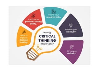 The document discusses various life competencies including creativity, innovation, critical thinking, collaboration, time management, personal growth, responsibility, communication, problem solving, and decision making. It provides definitions for each competency and explains their importance. For each one, it outlines several benefits and gives examples. The document emphasizes that life competencies play an important role in shaping individuals and preparing them to face challenges. It also acknowledges the teamwork required to present this information on life competencies.