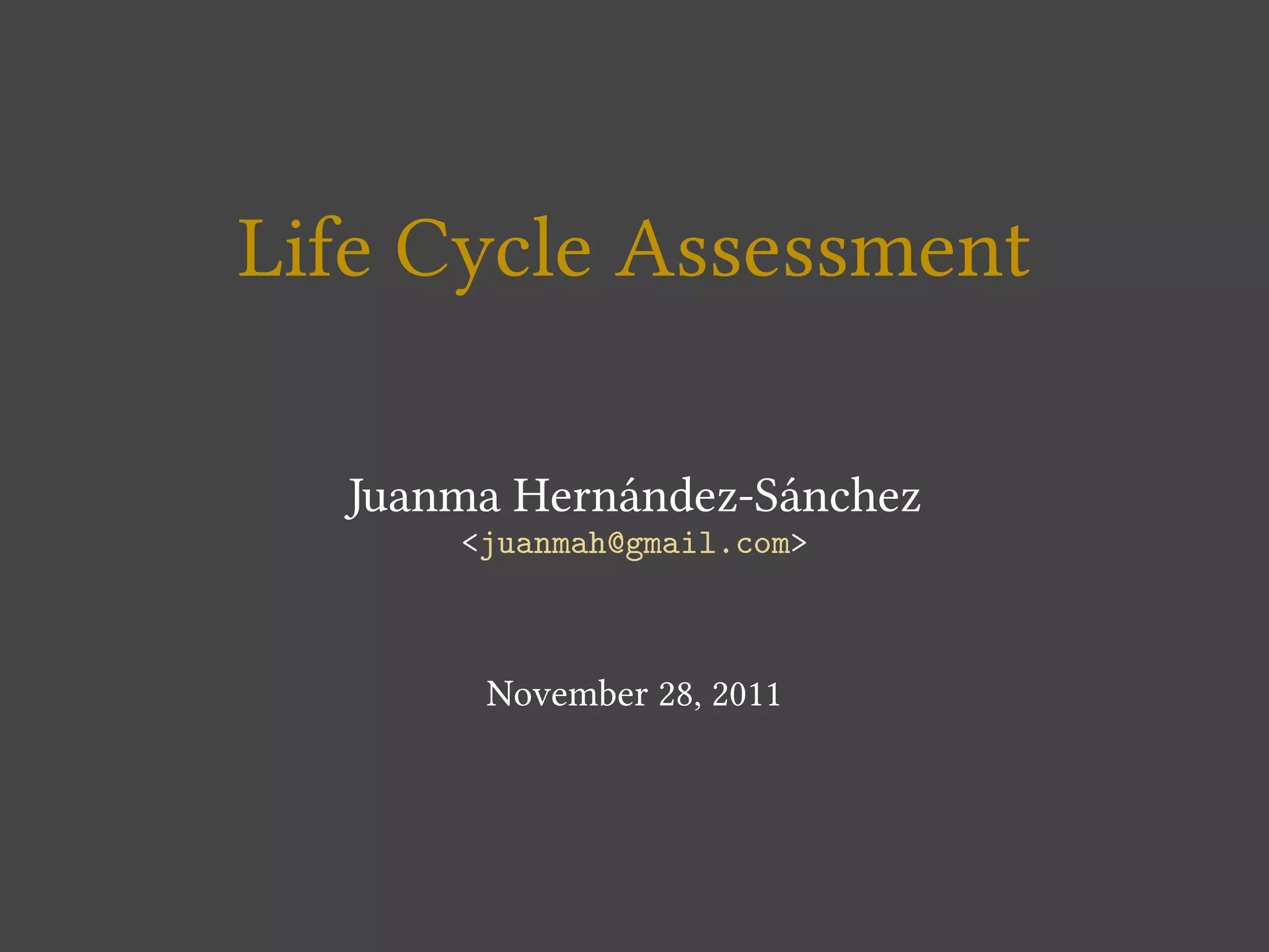 Life Cycle Assessment (LCA) is a technique used to assess the environmental impacts of a product or process across its lifecycle. It involves analyzing a product or process from raw material extraction, manufacturing, transportation, use, and disposal or recycling. The LCA process consists of four phases - defining the goal and scope of the assessment, conducting a life cycle inventory analysis, assessing the potential environmental impacts, and interpreting the results. The goal is to identify opportunities to reduce environmental impacts at each lifecycle stage.