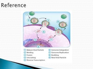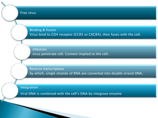 The document summarizes the HIV lifecycle in cells. It explains that HIV binds to CD4 receptors on cells, fuses with the cell membrane, and injects its RNA inside. The viral enzyme reverse transcriptase then converts the RNA into DNA, which is integrated into the cell's DNA by the integrase enzyme. The cell's machinery then reads the viral DNA and produces viral proteins. These proteins self-assemble into new virus particles that bud out of the cell, taking some cell membrane with them.