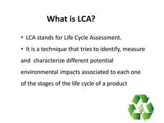 This document discusses Life Cycle Assessment (LCA), which aims to understand the environmental impacts of a product over its full life cycle from resource extraction to disposal. The key points made are: