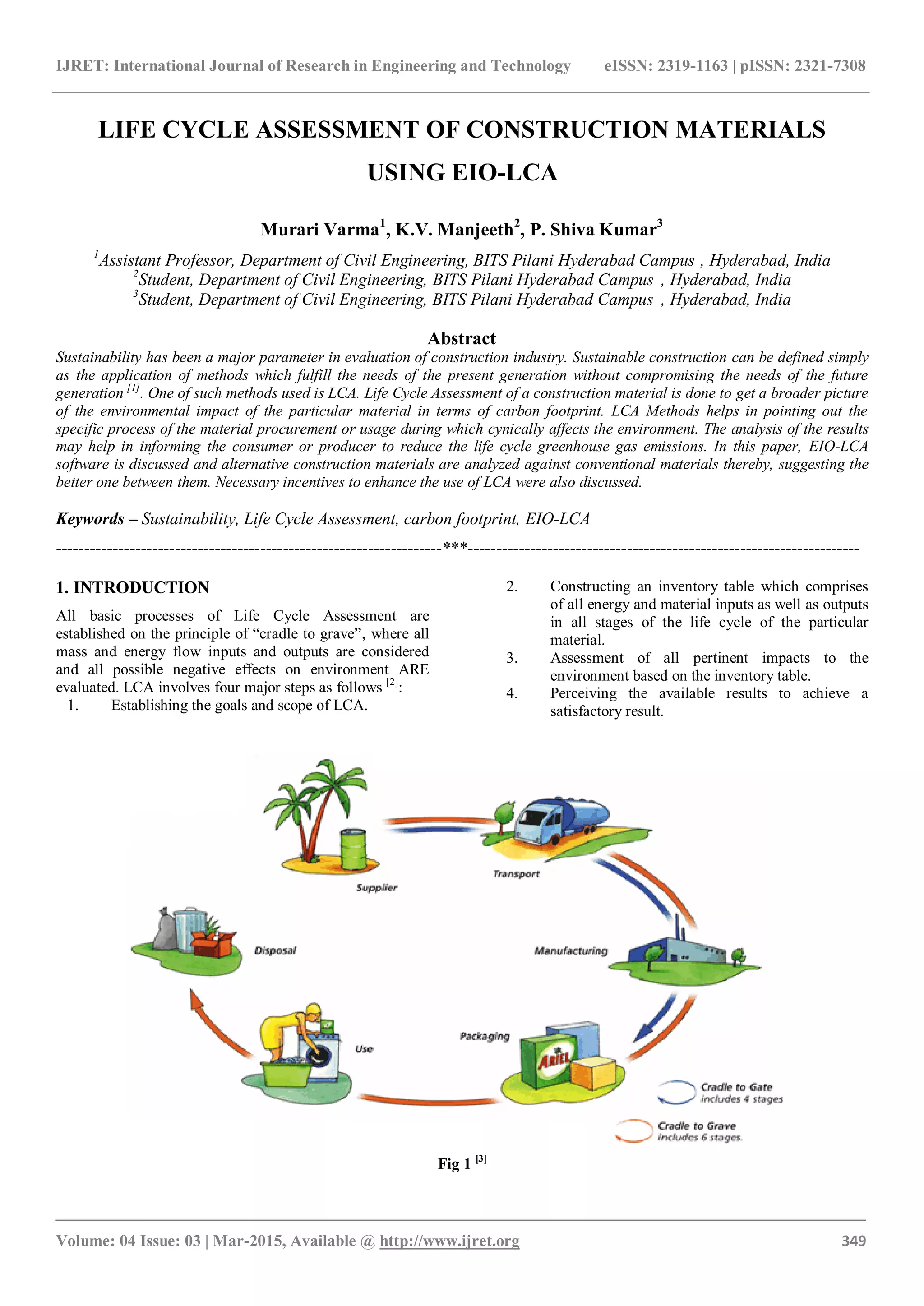 The document discusses the importance of sustainability in the construction industry through Life Cycle Assessment (LCA), specifically using the economic input-output LCA (EIO-LCA) method. It outlines the LCA process, its methodology, and advantages such as identifying environmental impacts and suggesting better alternative materials. The paper emphasizes the potential for EIO-LCA to enhance environmentally friendly practices in construction while also acknowledging its limitations and the need for incentives to promote its usage.