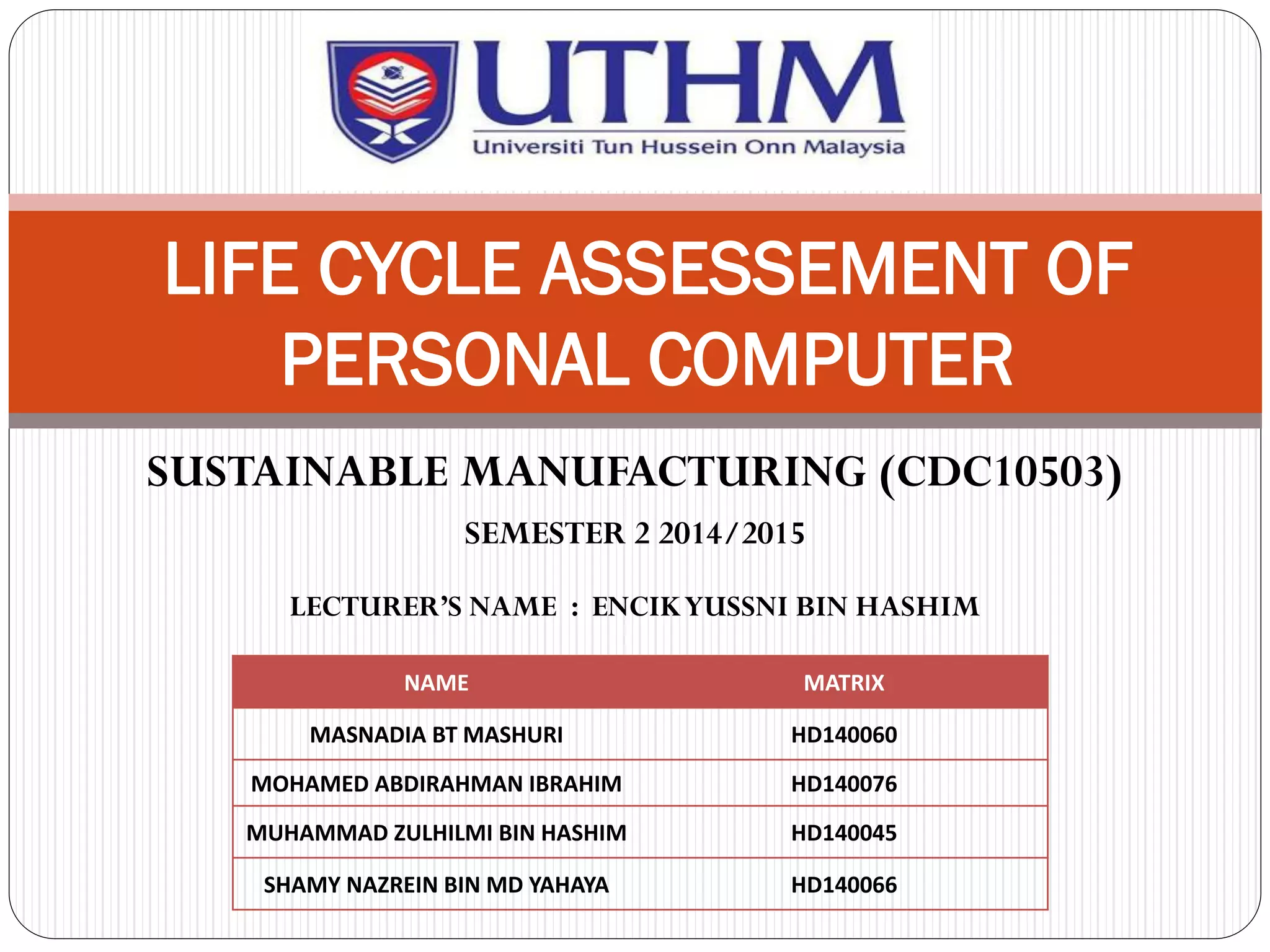 1) This document summarizes the results of a life cycle assessment (LCA) conducted on a personal computer. The LCA followed the four steps of goal and scope definition, inventory analysis, impact assessment, and improvement assessment.