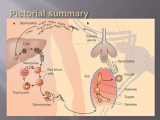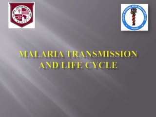 This document discusses malaria transmission and the life cycles of the malaria parasite and mosquito vector. It notes that malaria is transmitted between humans and mosquitoes, with the parasite undergoing development stages in both the liver and blood of humans, and in the gut and salivary glands of mosquitoes. The mosquito life cycle and factors influencing transmission patterns are also summarized.