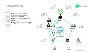 The document discusses the importance of lifecycle thinking and measuring environmental impact at every stage of a product's lifecycle to support circular economy initiatives. It highlights the Ecochain process, which incorporates cross-functional collaboration and data analysis to address environmental impacts, and includes examples such as Philips' sustainability-linked financial agreements. Key metrics are focused on reducing overall environmental footprints while enhancing the understanding of natural capital's economic value.