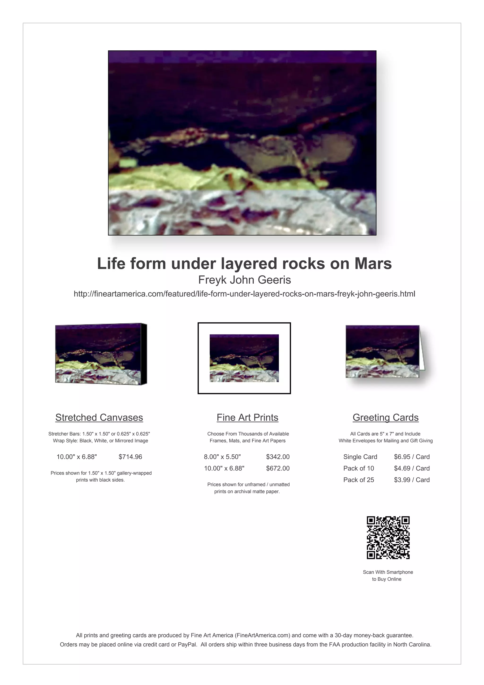 This document describes an image titled "Life form under layered rocks on Mars" by artist Freyk John Geeris. It provides pricing details for purchasing the image in different product formats from the Fine Art America website, including stretched canvas prints, unframed fine art prints, and greeting cards. Print sizes range from 8x5.5 inches to 10x6.88 inches, and greeting card packs are available with quantities of 10 or 25 cards. All products come with a 30-day money-back guarantee and ship within three business days of ordering.