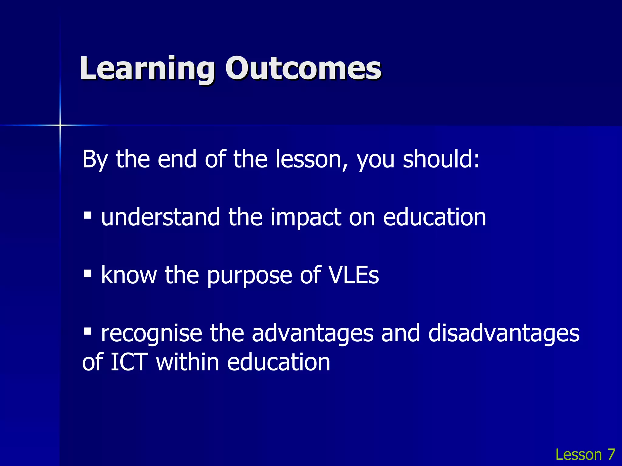 ICT has impacted education in several ways. It has affected both teaching and learning approaches, with teachers increasingly using tools like the internet, data projectors, and interactive whiteboards. Students now study IT as a subject and have more opportunities for online and virtual learning through VLE/MLE platforms. While ICT provides many advantages to education, there are also drawbacks like plagiarism, inaccurate online information, and difficulties ensuring standardized quality and sustainability of online educational experiences and resources.