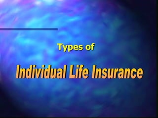 The document discusses the different types of individual life insurance, including term life insurance (which provides protection for a specified period), whole life insurance (which provides protection for one's whole life and has a savings component), universal life insurance (which separates the insurance and investment elements), and variable life insurance (where the cash value and death benefits may fluctuate based on investment performance). It provides examples of how death benefits and cash values change over time for different types and options.