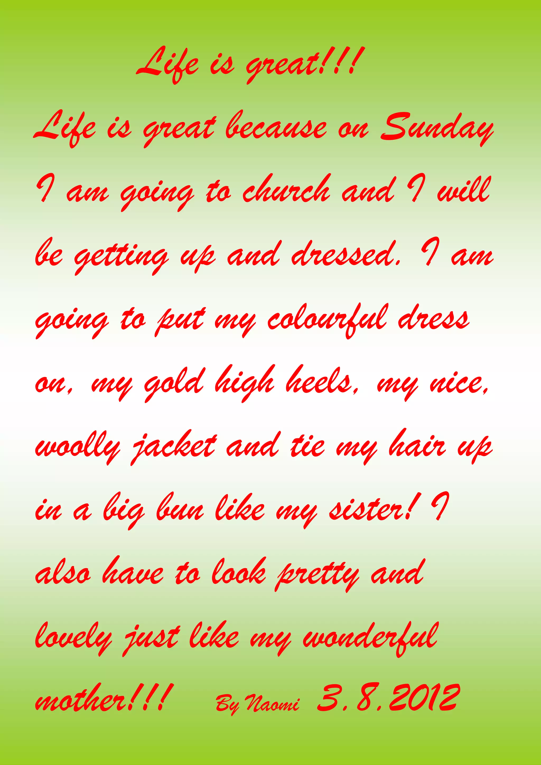 Naomi thinks life is great and dumb. She looks forward to getting dressed up and going to church on Sunday. However, she also thinks life is dumb when plans get cancelled, like going to the pool on a rainy day. Naomi enjoys spending time with friends but doesn't like having to change schools after just two weeks of making new friends. Overall, she has mixed feelings about life.