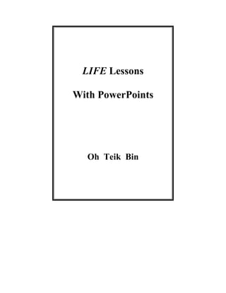 Life Lessons with Powerpoints is a collection of moral and dhamma messages presented through PowerPoint slides, aimed at imparting essential values and life lessons in a concise manner. The publication is dedicated to various contributors and emphasizes the importance of kindness, gratitude, and living a meaningful life. It is freely distributed to help educate and uplift the community, particularly the younger generation, in an era dominated by fast-paced digital communication.