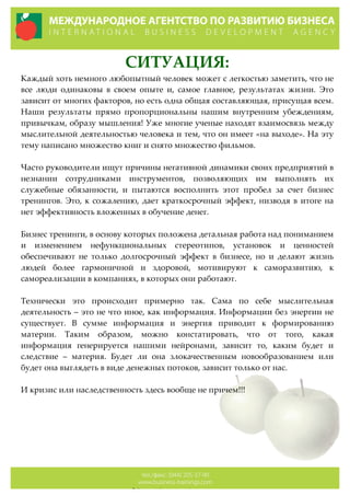 Документ описывает программу бизнес-тренинга, нацеленного на преобразование мышления участников для достижения долгосрочного успеха в бизнесе и жизни. Основное внимание уделяется изменению неэффективных убеждений и стереотипов, с акцентом на развитие личной ответственности и лидерских качеств. Тренинг включает теоретические и практические занятия, а также индивидуальную и групповую работу, с целью повышения вовлеченности участников и достижения устойчивых результатов.