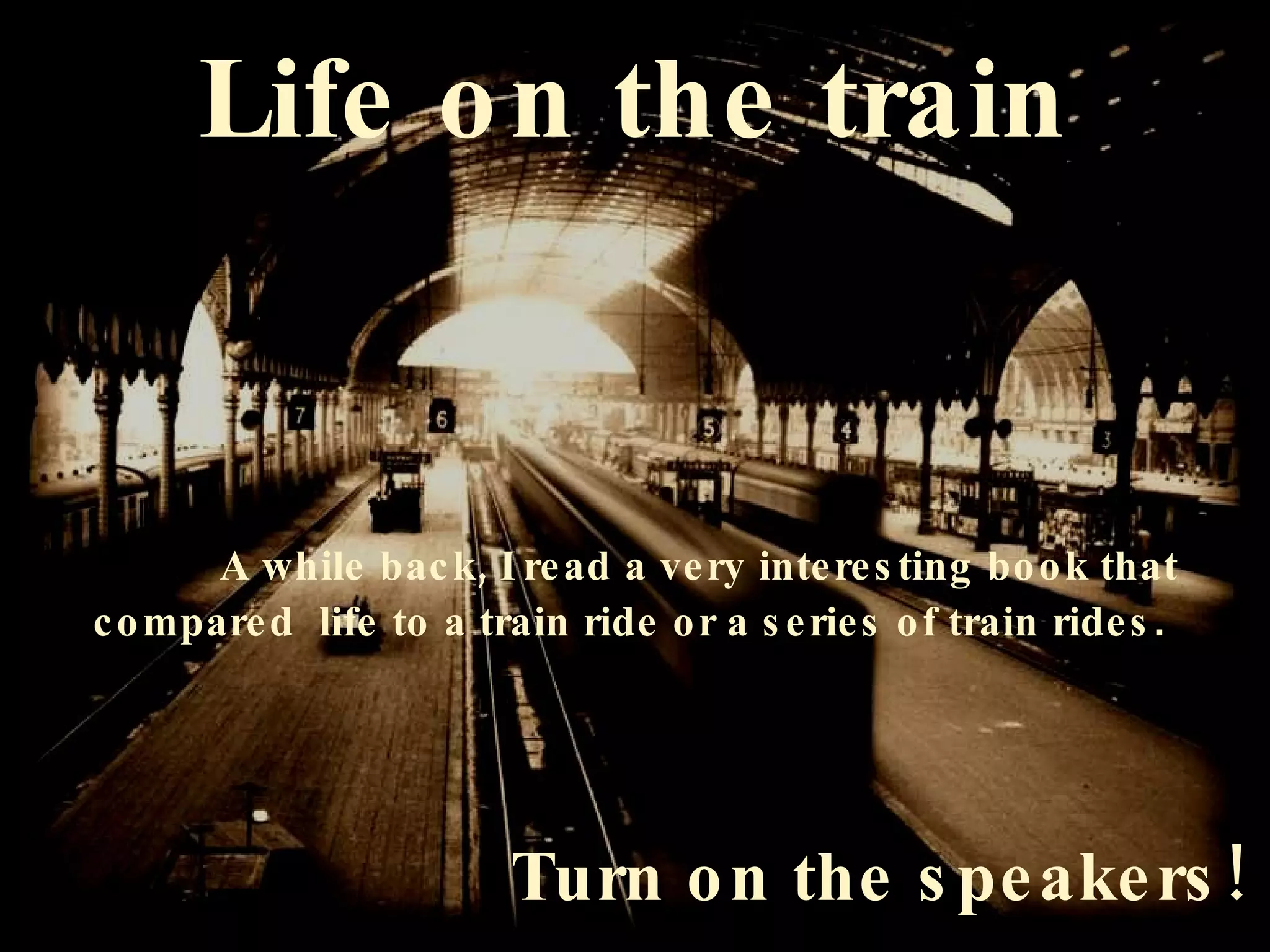 Life is compared to a train journey where people board the train, ride together for periods of time, and eventually disembark at different stops. Passengers experience joyful moments and sorrows, and both board and exit the train leaving impressions on others. While parents are with us for our earliest years, other passengers like friends and acquaintances become important and help enrich our lives through shared experiences before we all ultimately reach our final stop.