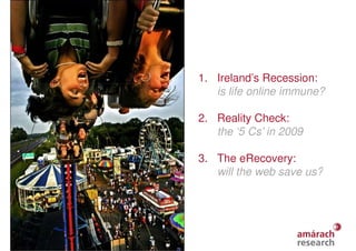 This document is a report from Amárach Research titled "Life Online 2009" that examines how the recession in Ireland is affecting internet usage. It contains 9 sections that discuss topics like how consumers are being impacted by the economic downturn, an analysis of content, communication, commerce, and other online activities of Irish internet users, and whether increased online activity may help drive an economic recovery. The report is based on a survey of 1,000 Irish adults and provides statistics on various online behaviors.