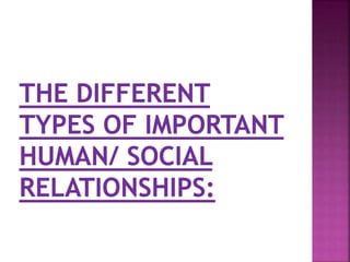 Social relationships can be described as the sum of social interactions between people over time, which can be positive or negative. Momentary social interactions involve parental care, dominance, aggression or fear. Relationships include immediate family, extended family, teachers and classmates at school, friends based on trust and shared interests, and romantic relationships in adolescence built on respect, care, trust and providing support for each other.