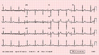 The document outlines various ECG diagnoses, including hyperacute ST elevation myocardial infarction (STEMI), atrial fibrillation, complete heart block, and hyperkalaemia, highlighting specific ECG features for each condition. It also discusses arrhythmias like supraventricular tachycardia and torsades de pointes, emphasizing the importance of ECG interpretation. A systematic approach to reading ECGs is provided, along with guidelines for normal and abnormal ECG descriptions.