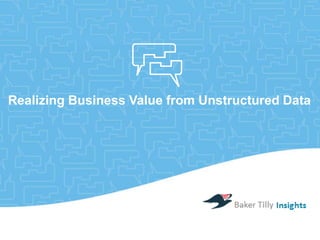 The document discusses the potential competitive advantage of leveraging unstructured data analytics across various industries, emphasizing the challenges in integrating these analytics into business models. It highlights specific business use cases such as clinical trial development and pharmacovigilance that can benefit from analyzing unstructured data sources like social media and clinical research. The document concludes with a call to action for Baker Tilly to assist companies in overcoming the barriers to utilizing unstructured data effectively.