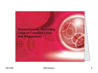 The document summarizes recent developments regarding codes of conduct for interactions between medical device companies and healthcare providers, including new legislation in Massachusetts. Key points include: