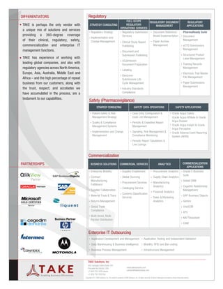 TAKE provides business solutions and services for the life sciences industry to help companies address challenges from increasing regulations and competition. They offer deep domain expertise, technology solutions, and business services across clinical development, regulatory, safety, and enterprise IT functions. This includes strategy consulting, data services, analytics, and application management. TAKE aims to help life sciences companies comply with regulations while remaining competitive through a unified approach combining strategic advice with efficient operations.
