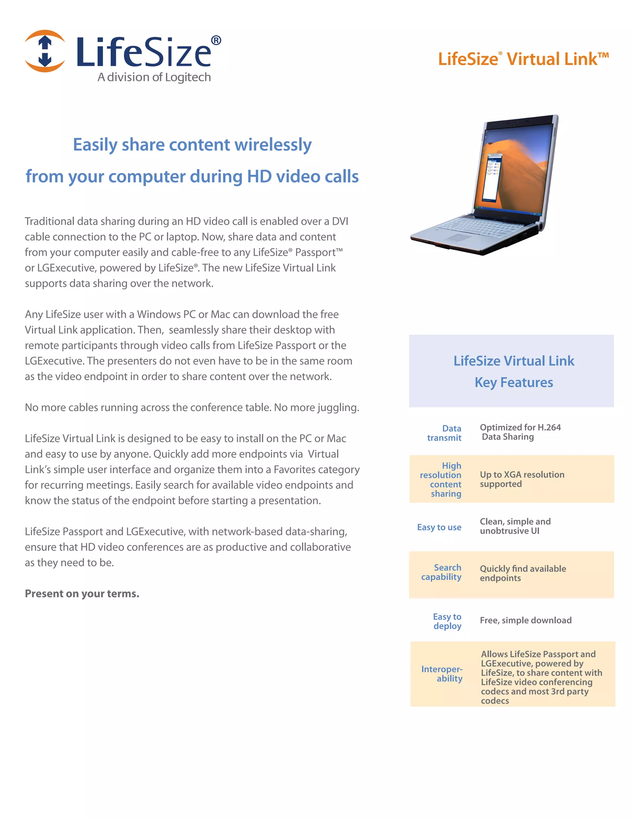 Lifesize® Virtual Link™ allows users to wirelessly share content during HD video calls without traditional cable connections. The application is compatible with Windows and Mac, facilitating seamless desktop sharing for remote participants and offering high-resolution support up to XGA. Key features include an intuitive user interface, easy installation, and compatibility with various Lifesize video conferencing codecs.
