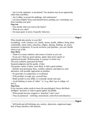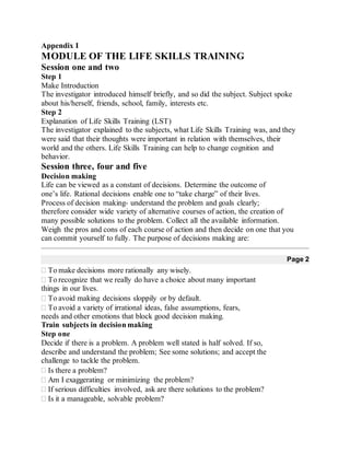 The document provides guidance on life skills training modules that focus on decision making, problem solving, creative thinking, and critical thinking. It outlines 8 steps for decision making that involve clearly defining problems, setting goals, brainstorming solutions, weighing pros and cons of options, selecting a best choice, and implementing decisions. The 9 steps for problem solving include defining problems, considering feelings, relaxing before solving, exploring solutions, evaluating solutions, selecting a choice, and reexamining problems. Sessions on creative and critical thinking describe characteristics and learning approaches for these skills.