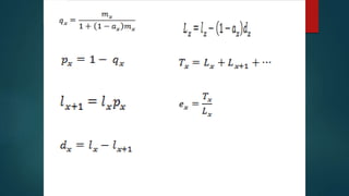 - Life tables provide a comprehensive method to describe mortality, survival, and other vital events in a population by showing how a group of infants would gradually die under constant conditions. They provide measures of longevity and are constructed separately for males and females.