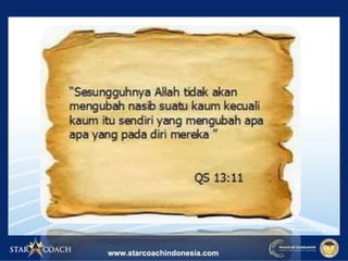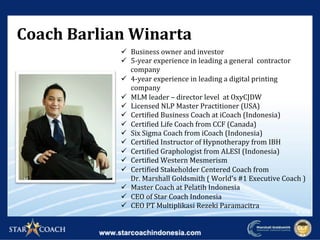 Dokumen ini merinci pengalaman dan kualifikasi Coach Barlian Winarta sebagai pemilik bisnis, pelatih bersertifikat, dan penulis dengan berbagai penghargaan. Ia menawarkan pandangan tentang transformasi hidup, menetapkan tujuan efektip, dan strategi untuk mencapai kesuksesan. Buku-buku yang ditulisnya juga berfokus pada peningkatan produktivitas dan manajemen keputusan.