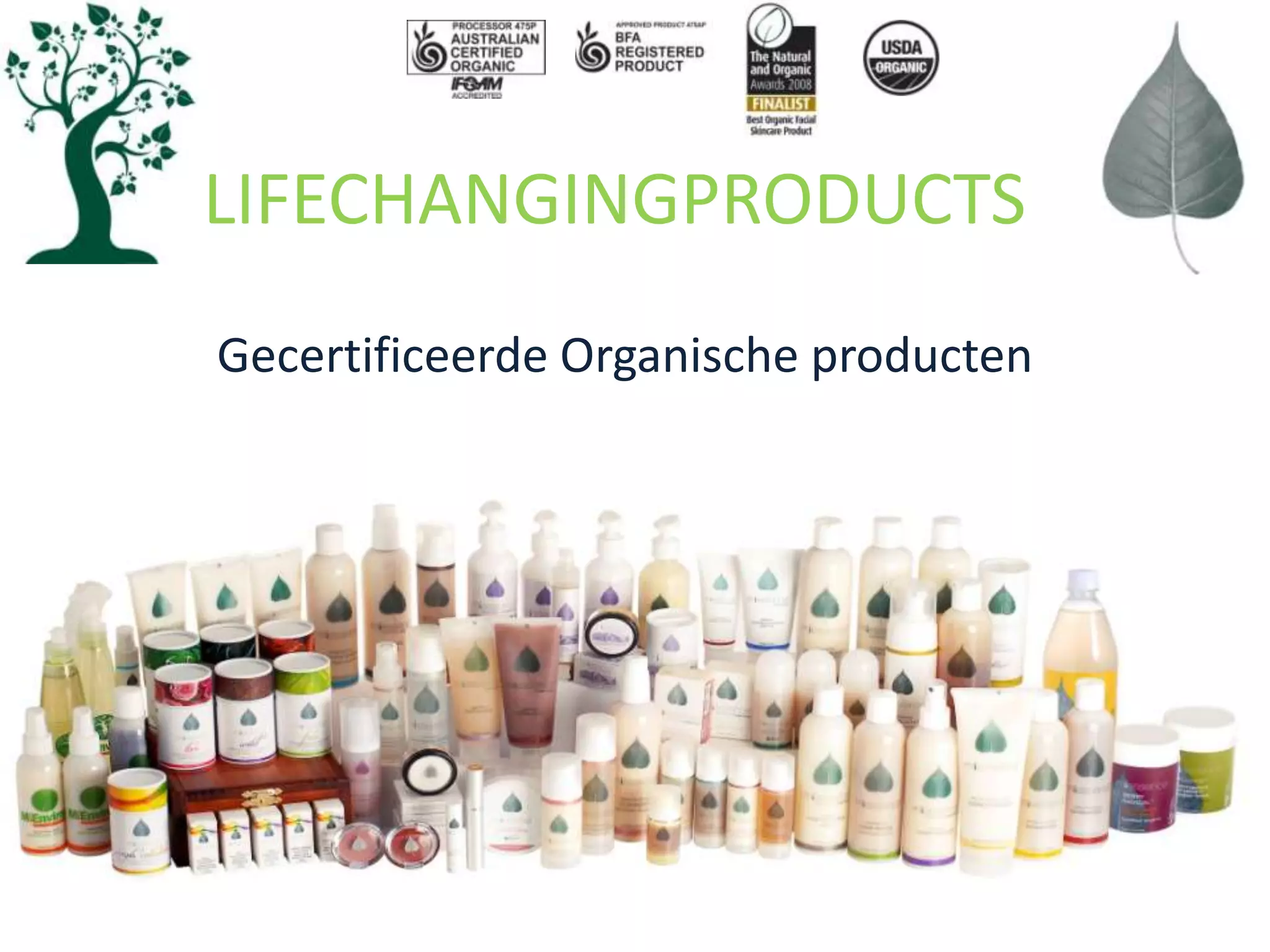 GecertificeerdeOrganische productenLIFECHANGINGPRODUCTSCosmeticaComplete cosmetica lijnGecertificeerde organische ingrediëntenGemakkelijk in gebruikWerelds eerste cosmetica lijn die volkomen puur is100 % chemicaliën, allergenen en parfum vrij