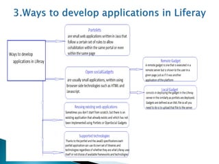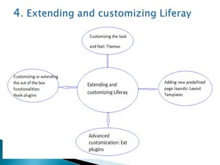 This document provides an overview of developing applications and customizing Liferay Portal. It discusses portlet development using the Plugins SDK, creating themes, using hooks to customize core functionality, extending Liferay through ext plugins, leveraging Liferay APIs, and concludes by stating Liferay's flexibility enables customizing the platform.