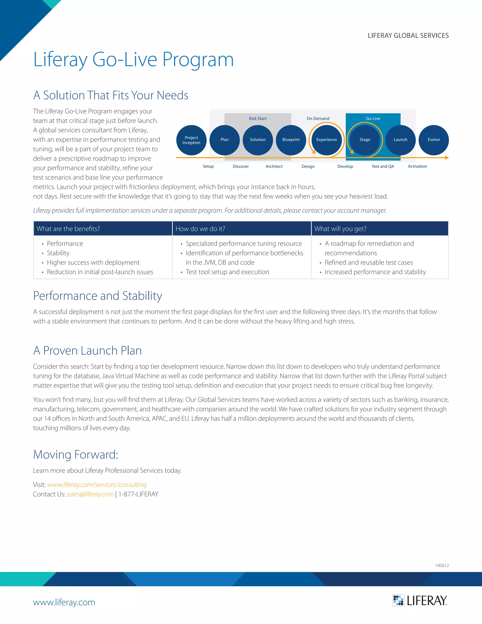 The Liferay Go-Live Program provides performance tuning and testing services to help clients successfully launch their projects. A Liferay consultant will work with the client's project team, identify potential performance bottlenecks, develop a roadmap for remediation, refine test cases, and help achieve stable performance after launch. The program aims to reduce initial post-launch issues and deliver a frictionless deployment process.