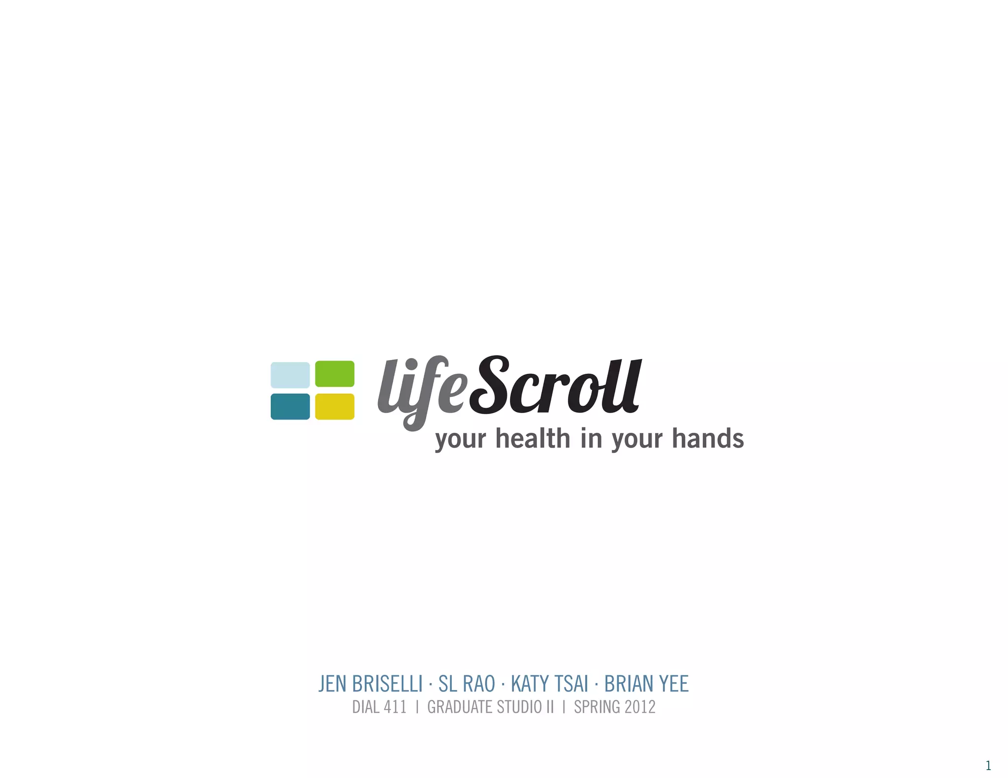 The document describes a student project to design a health information system called lifeScroll. It begins with an overview of the problem of navigating the complex healthcare system and introduces Angela as someone struggling with this problem. The project involved exploratory research including interviews to understand user needs and pain points. Key needs identified were simplified communication, clear information, and empowerment. Various design concepts are presented including a timeline view of health events and connections to medical records, doctors, and support communities. Finally, screenshots from a prototype demonstrate features like accessing insurance information and viewing doctor's notes.