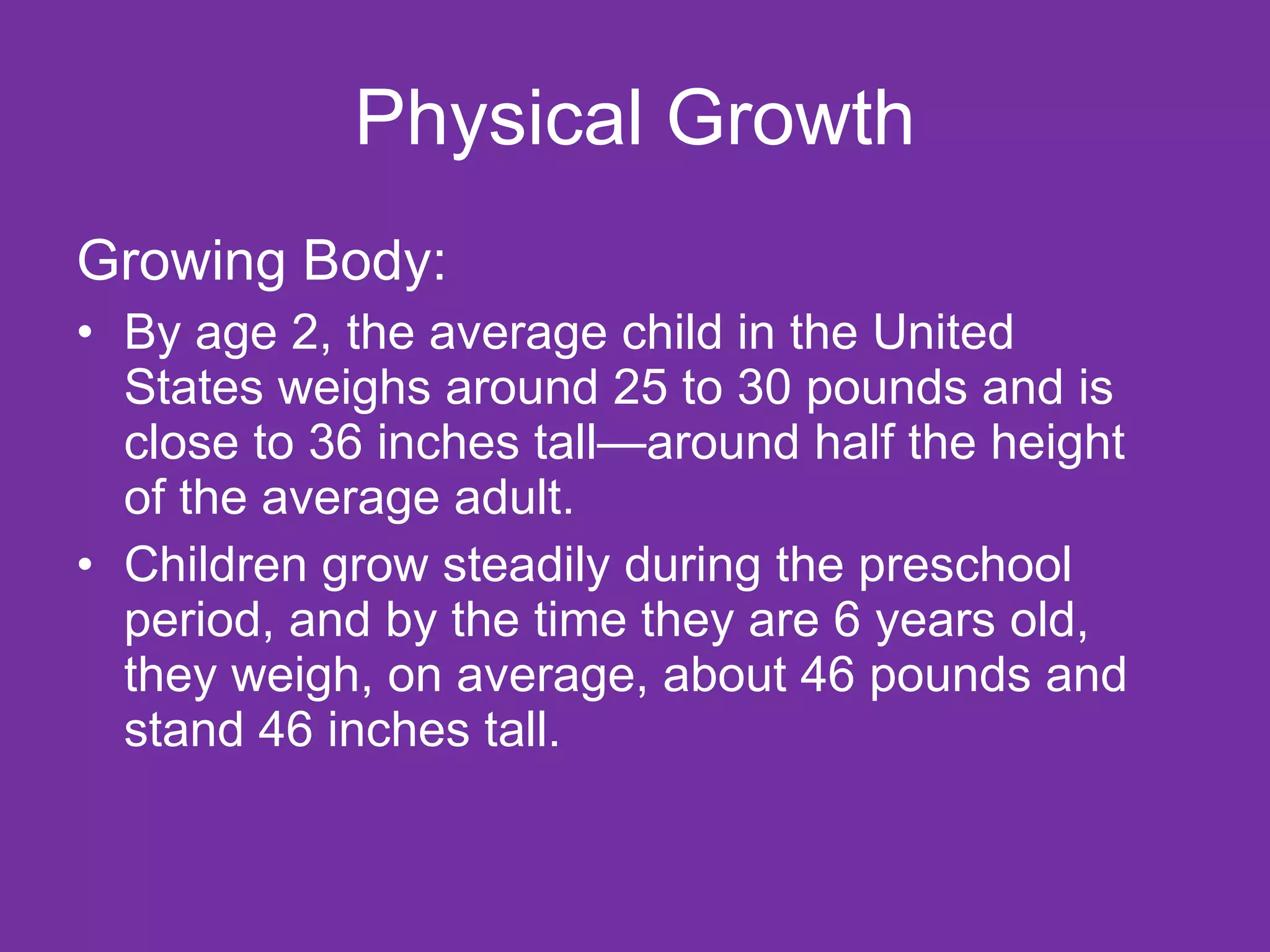 During the preschool years from ages 2 to 6, children experience significant physical, motor, and cognitive development. Physically, children nearly double in height and weight during this time. Their bodies also become less round and more slender as bones strengthen and muscle increases. Motor skills like fine motor coordination are practiced and improved. Cognitively, the brain grows rapidly through myelination and connections between hemispheres, supporting advances in memory, attention, and motor skills. By age 5, the brain weighs 90% of an adult's. Most children show preference for right or left handedness by the end of the preschool years.