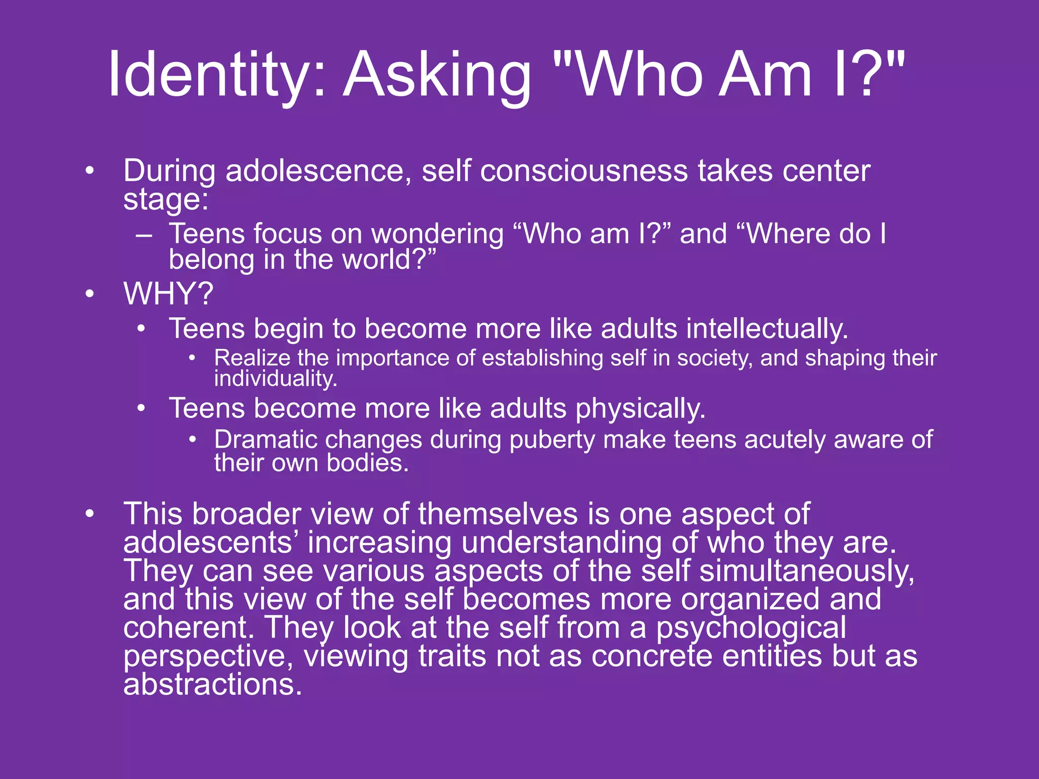The document discusses several key aspects of social and personality development during adolescence. It covers how teens develop their identity and sense of self through questioning who they are. It also explores how adolescents form self-concepts and self-esteem, and how factors like gender, race, and socioeconomic status can influence these. Erikson's psychosocial theory of identity formation is summarized, along with challenges like depression, suicide, and forming autonomy from family.