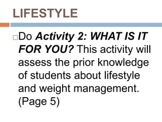 This document discusses lifestyle and weight management. It defines lifestyle as typical patterns of behavior like eating, sleeping, and exercise habits. Aspects of lifestyle that influence health include food choice, physical activity, and eating habits. Risk factors for diseases that can be changed through lifestyle include nutrition, body weight, physical activity, and health habits. Unhealthy lifestyles can lead to non-communicable diseases like cardiovascular disease, cancer, and chronic respiratory diseases. The document also discusses weight management, energy consumption and expenditure, and different types of active recreational activities and physical fitness.
