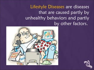 Lifestyle diseases are caused partly by unhealthy behaviors and habits that people have control over, such as smoking, diet, exercise, and sleep habits, as well as other uncontrollable factors. The document discusses cardiovascular diseases, cancer, and diabetes as examples of lifestyle diseases. It provides information on the causes and symptoms of cardiovascular diseases, ways to detect and treat them, as well as steps people can take to prevent cardiovascular diseases and other lifestyle diseases through diet, exercise, avoiding smoking and managing stress levels.