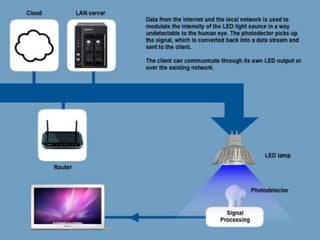 Li-Fi is a wireless optical network technology that uses LEDs to transmit data faster than the human eye can perceive, offering a fast and cost-effective communication system based on visible light communication. Invented by Professor Harald Haas in 2011, Li-Fi aims to enable data transmission for laptops and mobile devices through light. Applications of Li-Fi technology include traffic lights, aircraft cabins, underwater communication, and street lights.