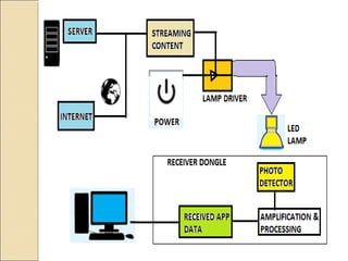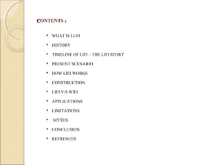 Li-Fi is a technology that uses light from LED bulbs to transmit data wirelessly. It provides high-speed connectivity and is seen as a supplement to Wi-Fi networks. The document traces the history of Li-Fi from experiments in the 1990s to recent demonstrations of speeds over 100Mbps. It describes how Li-Fi works by switching LED bulbs on and off very fast to transmit binary code. Potential applications include use in vehicles, airplanes, hospitals and underwater. While Li-Fi has limitations like inability to pass through walls, it could provide connectivity through devices like street lamps at a low cost.