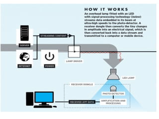 Li-Fi is a wireless optical networking technology that uses light-emitting diodes (LEDs) for data transmission. It can provide higher data rates than Wi-Fi and has advantages like highly localized coverage so data cannot pass through walls, lower energy consumption than Wi-Fi, and ability to use existing light infrastructure. Li-Fi works by varying the intensity of light from an LED to transmit digital data. A photo detector at the receiver converts light intensity variations back into an electrical signal and data. Potential applications of Li-Fi include use in aircraft, hospitals and other places where Wi-Fi is restricted.