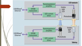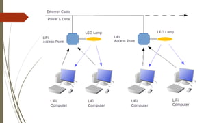 LiFi is a wireless optical networking technology utilizing LEDs for data transmission, designed to provide high-speed connectivity. It was popularized by Professor Harald Haas in 2011, leading to the formation of the LiFi Consortium and advancements like a prototype smartphone. Key advantages include faster data speeds, enhanced security, and reduced interference compared to traditional Wi-Fi, though it faces challenges such as line-of-sight limitations and high installation costs.
