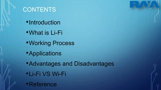 Li-Fi is a technology for wireless communication using light to transmit data and position information. It was invented by Harald Haas at the University of Edinburgh in 2011. Li-Fi uses light-emitting diodes (LEDs) that can be switched on and off at an extremely high speed to transmit data over the visible light spectrum. The LEDs would act as transmitters, while photodetectors act as receivers. Compared to Wi-Fi, Li-Fi has a faster transmission speed of up to 1Gbps, a broader spectrum range, and no interference issues. Potential applications of Li-Fi include use in vehicles, traffic lights, airplanes, underwater, and hospitals due to its availability, efficiency,